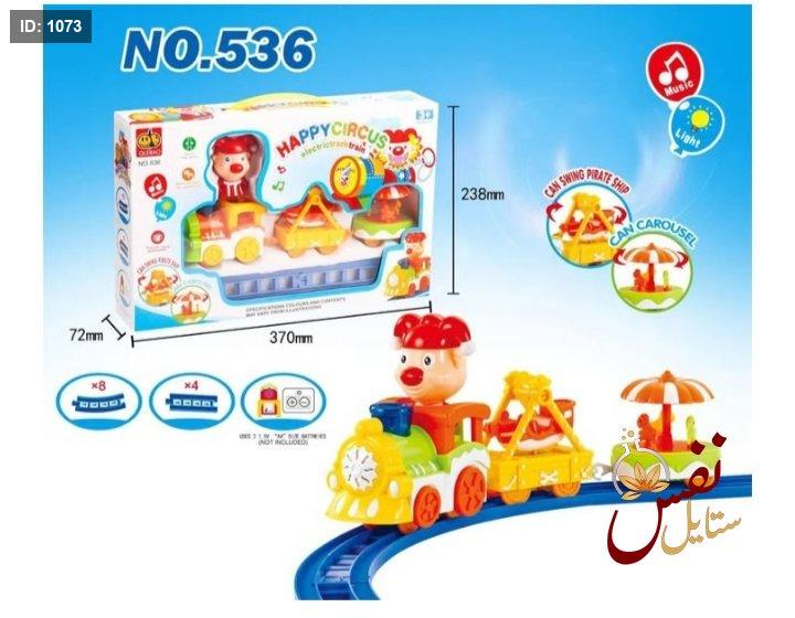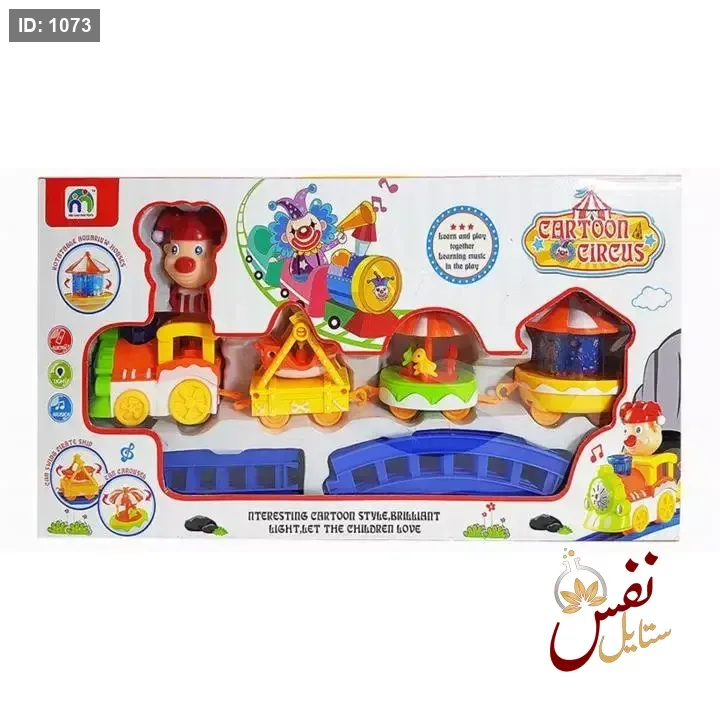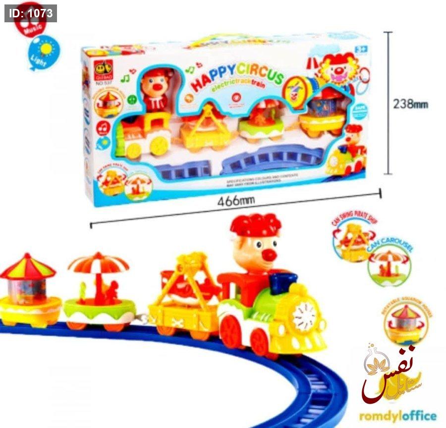 قطار لعبة كهربائي للأطفال بتصميم سيرك، يشمل مسار وعربات ملونة.