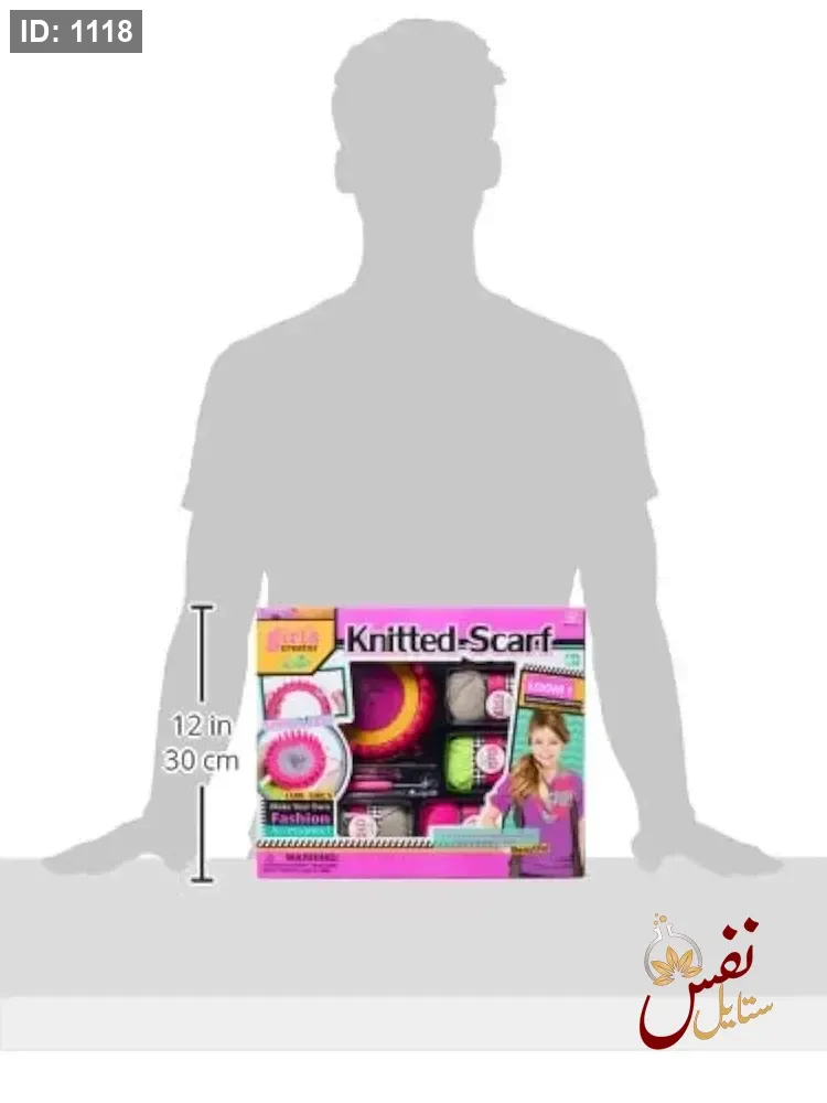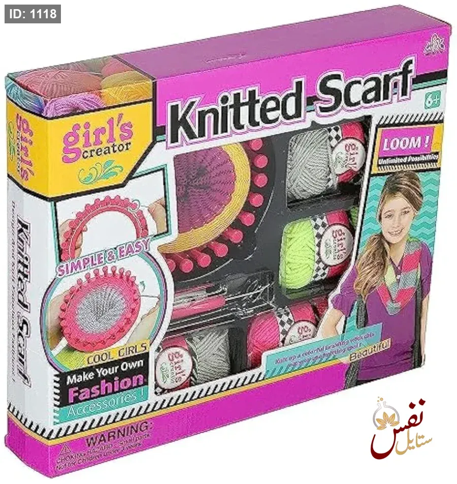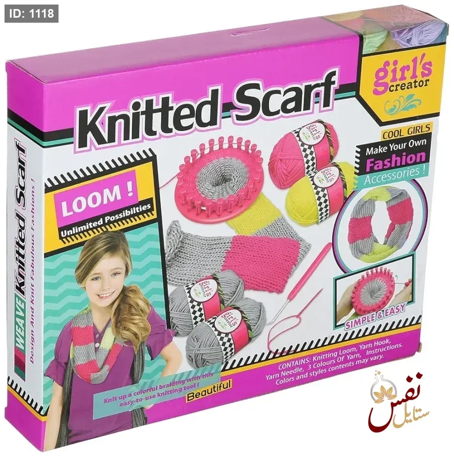 تتضمن المجموعة خيوطًا ملونة (وردي، رمادي، أصفر)، نول حياكة، وأدوات الحياكة الأساسية.