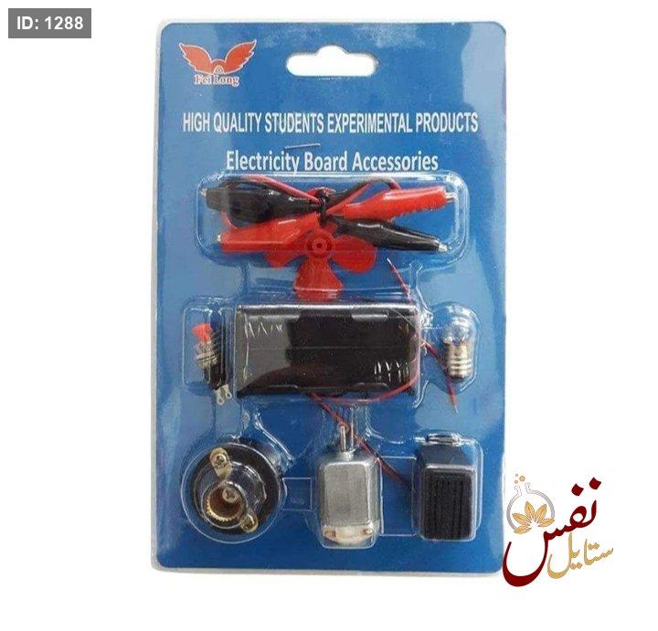 تتضمن المجموعة مكونات مختلفة مثل أسلاك توصيل بمشابك، وحامل بطارية، ومصباح كهربائي، ومحرك صغير، وحامل مصباح.