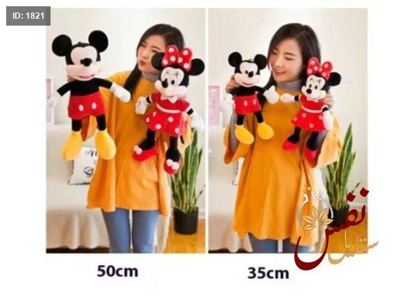 دمى محشوة بثلاث احجام لميكي ماوس وميني ماوس، حيث تظهر ميني ماوس بفستانها الأحمر المنقط وربطة رأسها المميزة، بينما يظهر ميكي ماوس بملابسه الكلاسيكية.