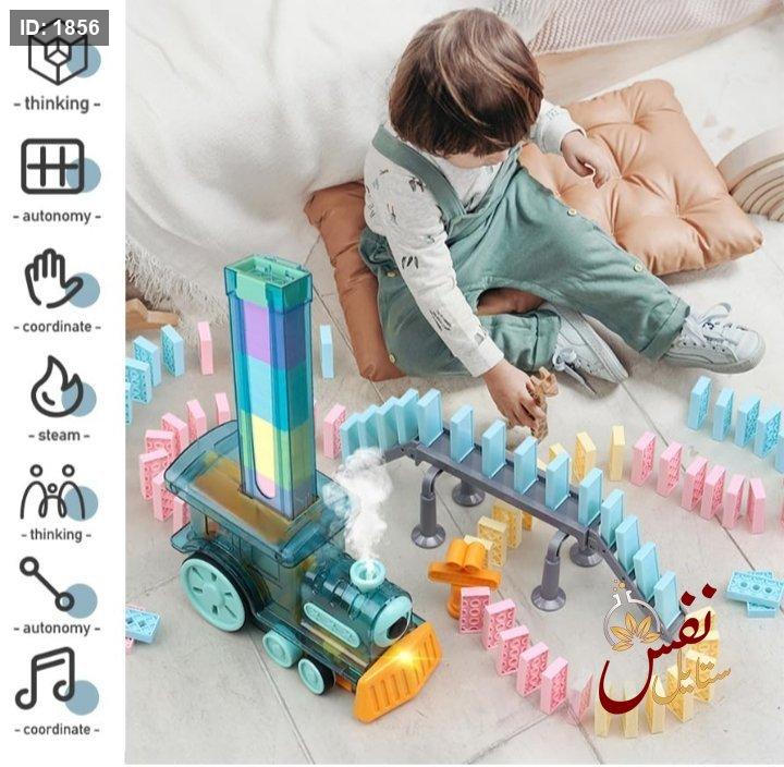 قطار يضع قطع الدومينو تلقائيًا أثناء حركته، لتشكيل مسارات دومينو مثيرة.