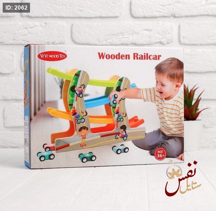 لعبة قطار خشبي ذات مسار متدرج وعربات صغيرة تنزلق عليه.