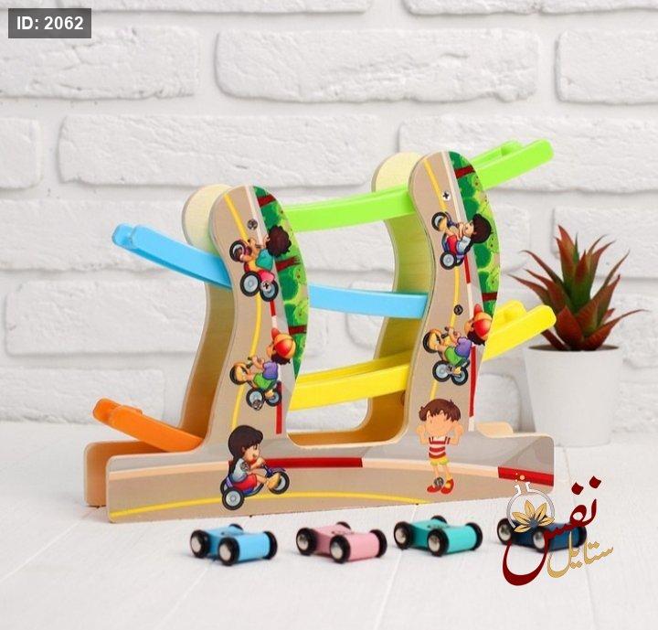 المحتويات: تتضمن مسارًا خشبيًا وعربات صغيرة قابلة للانزلاق.