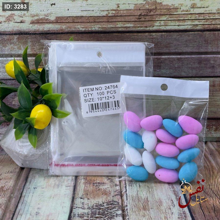 مجموعة (100كيس) تغليف شفاف مع تعليقة وشريط لاصق حجم 10*12 سم