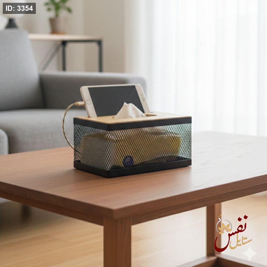 علبة محارم معدن غطاء خشب مع حامل جوال