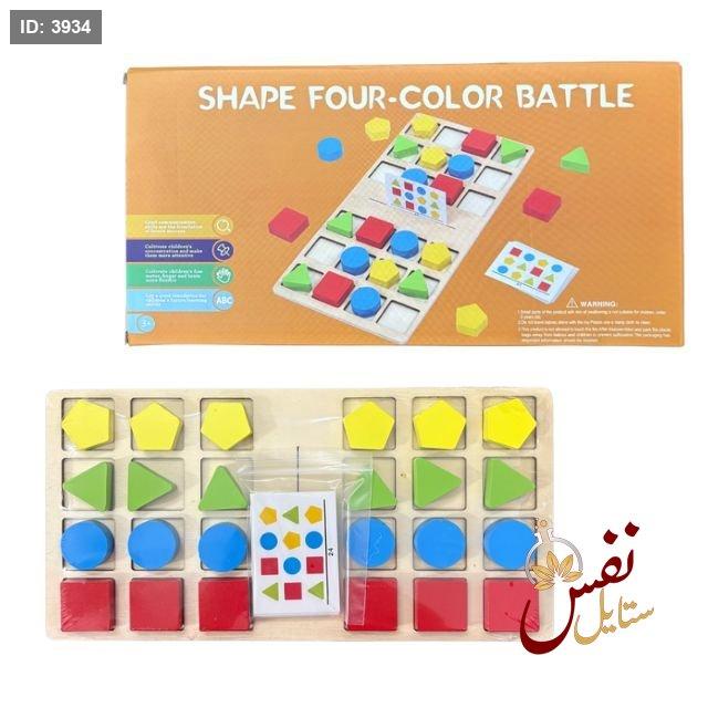 المكونات: لوح خشبي يحتوي على أشكال هندسية ملونة (مربع، دائرة، مثلث، سداسي) بأربعة ألوان (أحمر، أزرق، أخضر، أصفر)، ومجموعة من بطاقات التحدي.