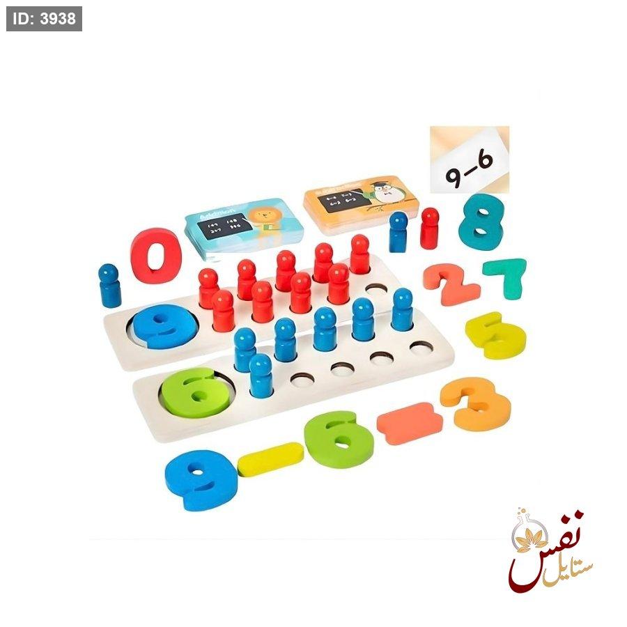 تتضمن أرقامًا خشبية ملونة، ولوحًا به ثقوب، وأوتادًا، وبطاقات تعليمية.