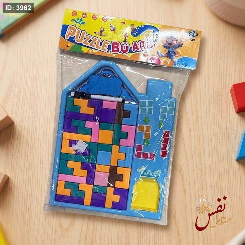 المميزات: تتضمن لوحًا على شكل منزل، وقطعًا ملونة بأشكال هندسية مختلفة، وقلمًا للرسم على اللوح الأبيض المدمج.