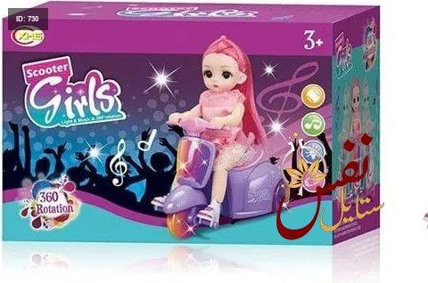 تتضمن اللعبة دمية ترتدي فستانًا ورديًا وتجلس على سكوتر بنفسجي اللون.