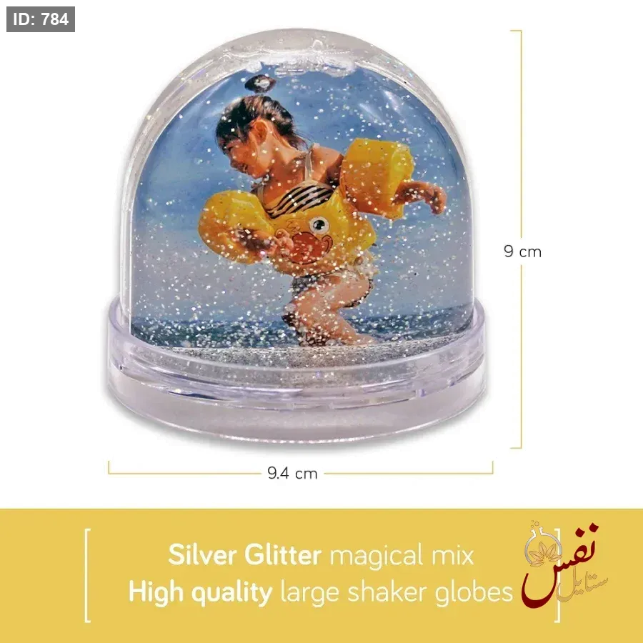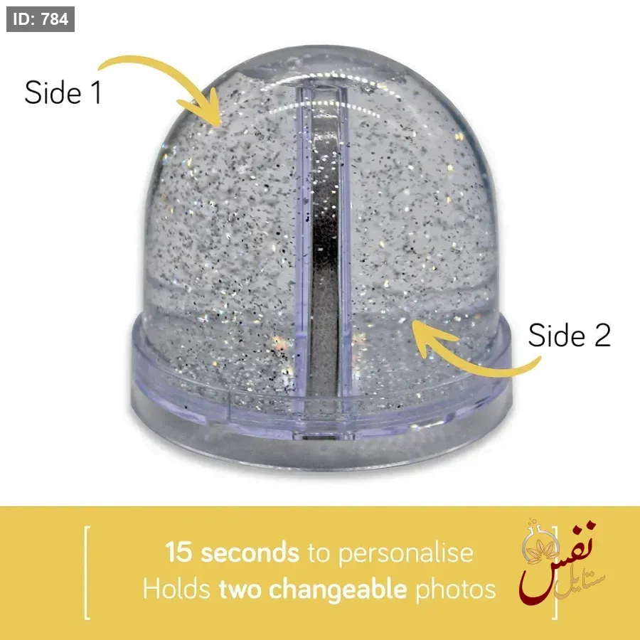 قاعدة كرة ثلجية تحتوي على بريق فضي، وهي مُصممة لحمل صورتين قابلتين للتغيير. وفقًا للنص الموجود في الصورة، يمكن تخصيصها في 15 ثانية.